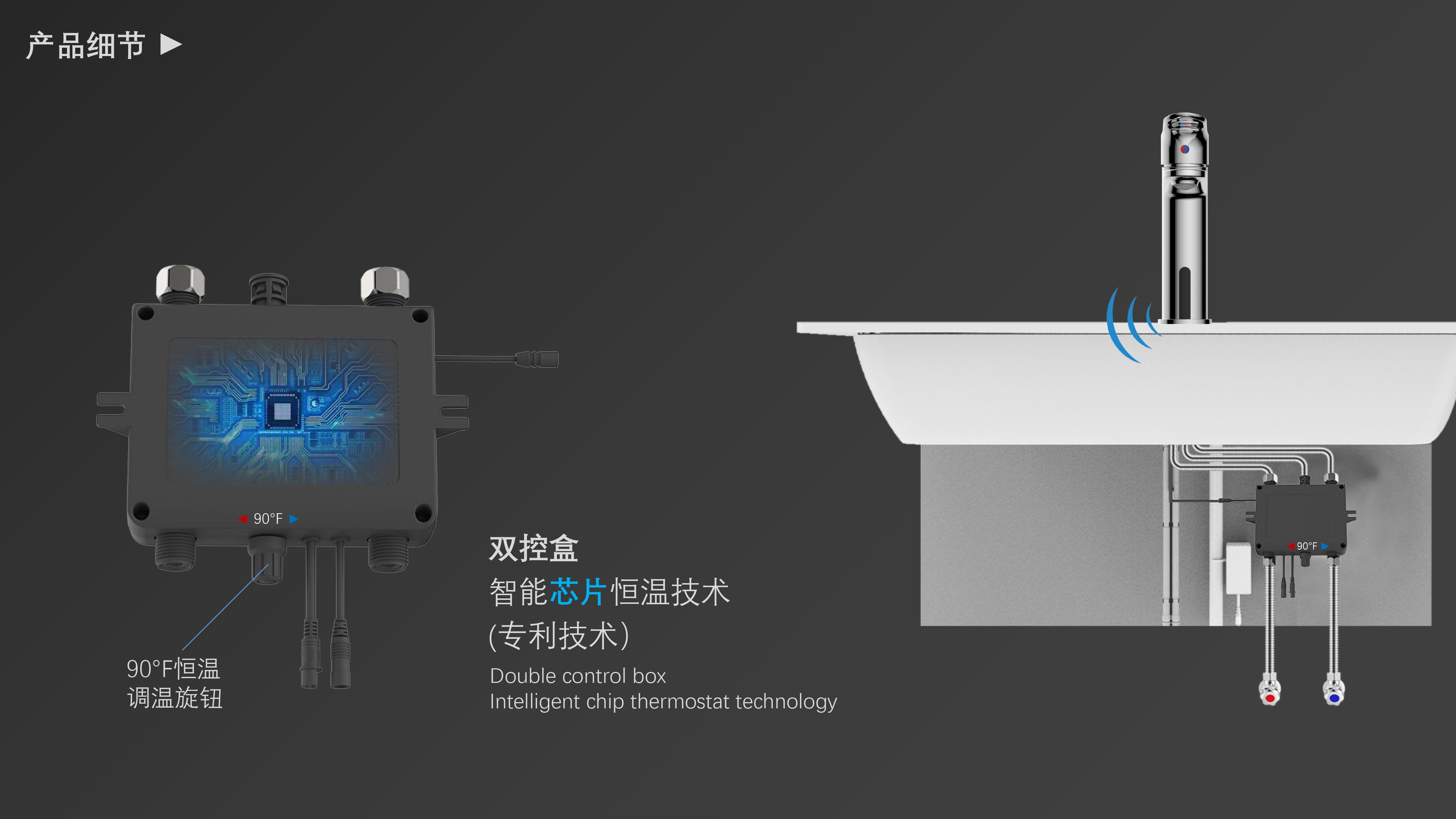 cUPC/ NSF61/ AB1953/ WaterSense/ ADA認(rèn)證;雙控面盆龍頭;感應(yīng)免接觸啟閉,有效感應(yīng)距離20cm;智能芯片恒溫專利技術(shù)雙控盒;氣泡水出水細(xì)膩不飛濺